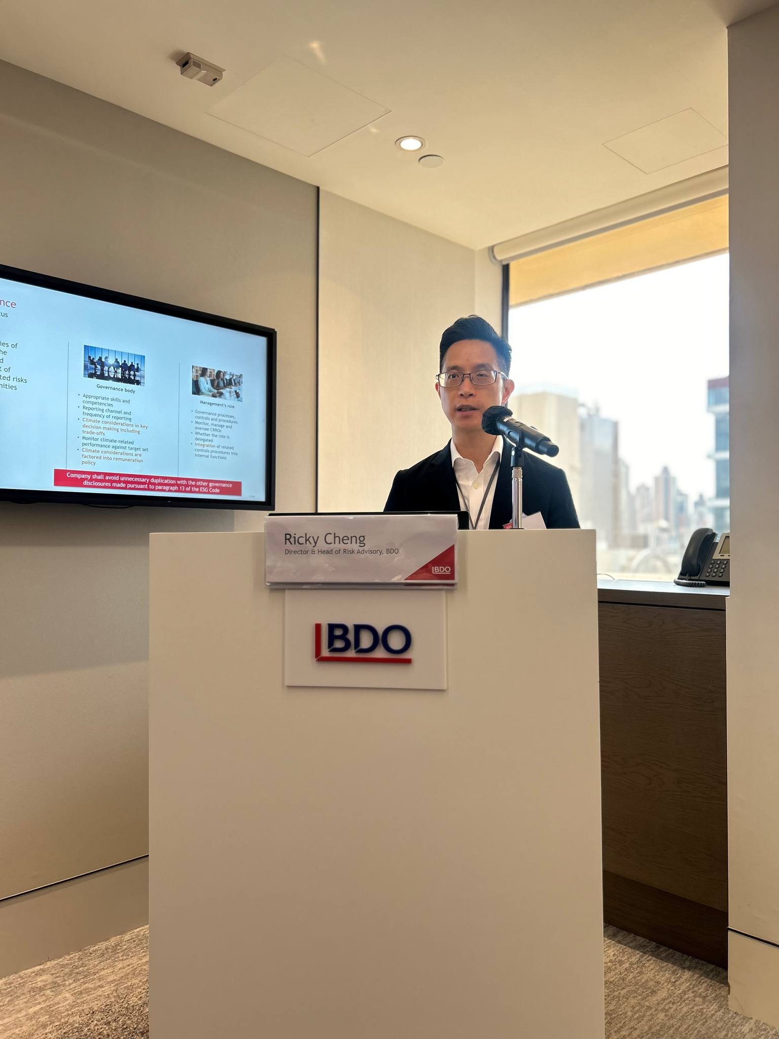 Ricky Cheng, Director & Head of Risk Advisory, Vijo Fok, Principal of Risk Advisory and Alpha Chia, Manager of Risk Advisory discussed on topics related to the new climate-related disclosure requirements, including an overview of ESG Reporting Code, a closer look at the new disclosure requirements, illustrative examples and how BDO could help companies to address the new disclosure requirements.
