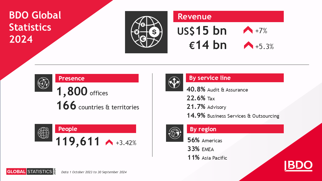 BDO announces combined global revenues of US$15 billion (€13.9 billion) for the financial year ending 30 September 2024, an increase of 7% USD (5% EUR). Service lines performed strongly, delivering consistent success across key areas.